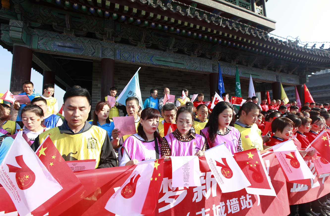 為慶祝中華人民共和國成立70周年,9月25日早上9:00住宅二攜手下屬基層單位陜西中盛建設科技服務有限公司共計130余人在西安古城墻上開展了系列慶祝活動,長樂坊所轄的八仙庵社區也參加了本次活動。